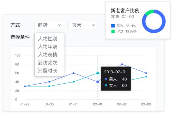 帮助建立到店客流用户画像 从性别、年龄、表情、新老顾客、滞留时长等维度建立用户画像 | |