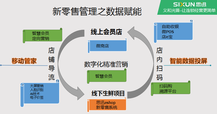 没错,现在的零售行业已经下沉多样了,盒马鲜生和苏宁小店的模式正在疯狂影响着零售业的走向。基于此义和光普思迅软件对于新零售时代的商业管理数据赋能模型如下图: