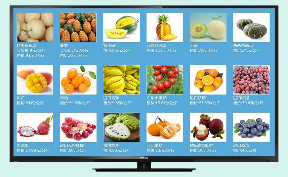 将商品图与价格一同展示在平板电视,又形象又直观,后台更新数据,前台界面价格实时更新,展示最新时段商品的售价及商品图片信息等。